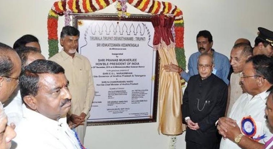 हैदराबाद। राष्ट्रपति प्रणब मुखर्जी ने आंध्र प्रदेश के आई-भीमवरम में तिरुमला तिरुपति देवस्थानम (टीटीडी) की वेदपाठशाला का उद्घाटन किया। राष्ट्रपति ने इस मौके पर कहा है कि वेद हमारी विरासत और संस्कृति के स्रोत हैं, उनसे ही हमारी मूल्यों की नींव पड़ी है। उन्होंने कहा कि वेदों में निहित विचार न केवल किसी व्यक्ति विशेष, समाज और राष्ट्र के लिए हैं, बल्कि वे विश्व बंधुत्व की भावना को प्रकट करते हैं, वेद हमें ज्ञान, बुद्धि और समझ प्रदान करते हैं। राष्ट्रपति ने कहा कि वेदपाठशालाएं वैदिक ज्ञान के लिए एक संस्थागत ढांचा उपलब्ध कराती हैं। उन्होंने वेदों की मौखिक परंपरा को संरक्षित करने के उपायों की शुरुआत और वैदिक शिक्षा को लोकप्रिय बनाने की खातिर अभिनव कार्यक्रम तैयार करने के लिए आंध्र प्रदेश सरकार और तिरुमला तिरुपति देवस्थानम को बधाई दी।