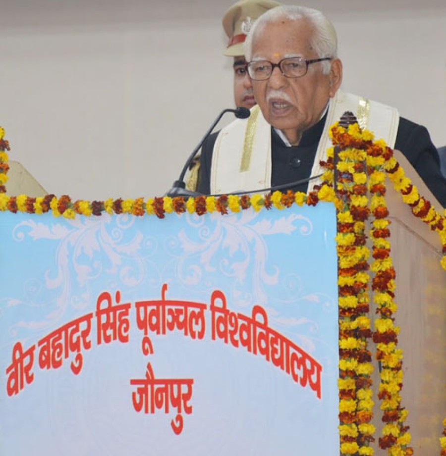 जौनपुर। उत्तर प्रदेश के विश्वविद्यालयों के कुलपतियों का वीर बहादुर सिंह पूर्वांचल विश्वविद्यालय जौनपुर के कुलपति सभागार में शनिवार को सम्मेलन हुआ। सम्मेलन की अध्यक्षता कुलाधिपति और राज्यपाल राम नाईक ने की। सम्मेलन में कुलपतियों को नववर्ष एवं मकर संक्रांति की शुभकामनाएं देते हुए कुलाधिपति और राज्यपाल ने कहा कि यह प्रसन्नता की बात है कि वर्ष 2015 के प्रारंभ में कुलपतियों एवं कुलसचिवों के साथ हुई बैठक में उच्च शिक्षा सुधार के निमित्त जो निर्णय लिये गये थे, उनके सामंजस्यपूर्ण अनुपालन के फलस्वरूप शैक्षिक सत्र 2014-15 की परीक्षाएं सही समय पर कराने एवं उनके परीक्षा परिणाम घोषित करने में सफलता मिली है। उन्होंने कहा कि विश्वविद्यालयों की प्रवेश प्रक्रिया, छात्रवृत्ति आवेदनों का पंजीकरण, परीक्षा की उत्तर पुस्तिकाओं का मूल्यांकन एवं अभिलेखों को पारदर्शी बनाने के लिए ऑनलाइन डिजिटाइजेशन के अभिनव प्रयास सराहनीय हैं। उन्होंने कहा कि दीक्षांत समारोह में दीक्षांत वेशभूषा में परिवर्तन कर भारतीय वेशभूषा अपनाते हुए 10 विश्वविद्यालयों के दीक्षांत समारोह बड़े ही अच्छे ढंग से सफलतापूर्वक सम्पादित कराये जा चुके हैं।
