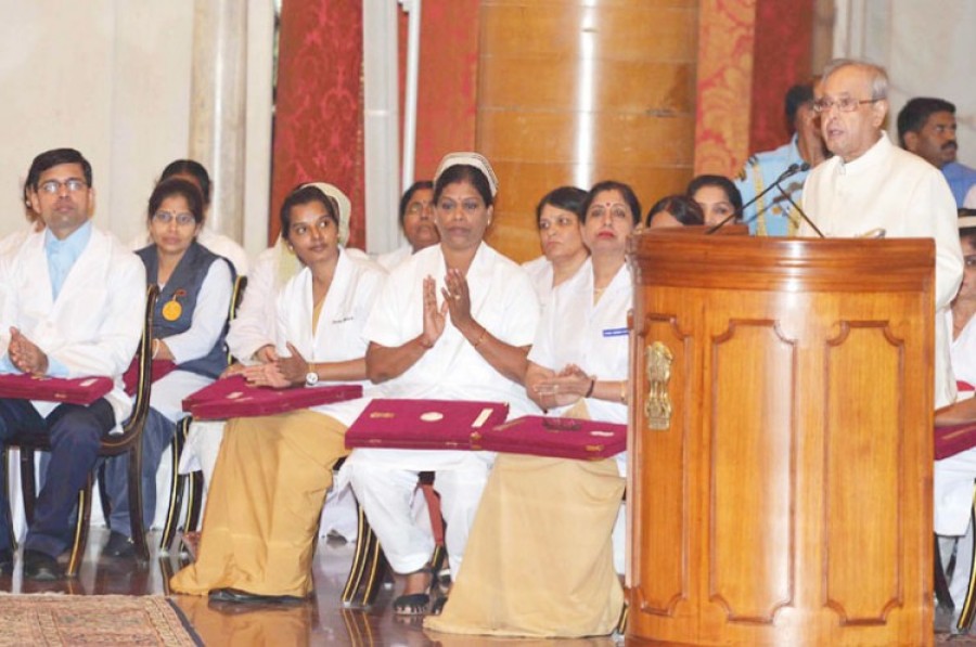 नई दिल्ली। राष्ट्रपति प्रणब मुखर्जी ने आज राष्ट्रपति भवन में अंतर्राष्ट्रीय नर्सिंग दिवस पर नर्सिंग कर्मियों को राष्ट्रीय फ्लोरेंस नाइटिंगेल पुरस्कार प्रदान किए। राष्ट्रपति ने कहा कि नर्सिंग कर्मी स्वास्थ्य देखभाल प्रणाली की रीढ़ हैं, स्वास्थ्य के सभी पहलुओं में चाहे यह पोलियो उन्मूलन, मिड वाइफ सेवा और सामुदायिक शिक्षा जैसे राष्ट्रीय स्वास्थ्य कार्यक्रम हों, नर्स की भूमिका महत्वपूर्ण और अनुकरणीय होती है, उनके समर्पण और देखभाल की प्रशंसा शहरी और देश के दूरदराज के क्षेत्रों सहित ग्रामीण क्षेत्रों में भी की जाती है। राष्ट्रपति ने कहा कि देश के स्वास्थ्य लक्ष्य की प्राप्ति में नर्सिंग कर्मियों की भूमिका महत्वपूर्ण है, स्वास्थ्य क्षेत्र की नीतियां बनाते समय नर्सिंग समुदाय की राय लेना महत्वपूर्ण है।