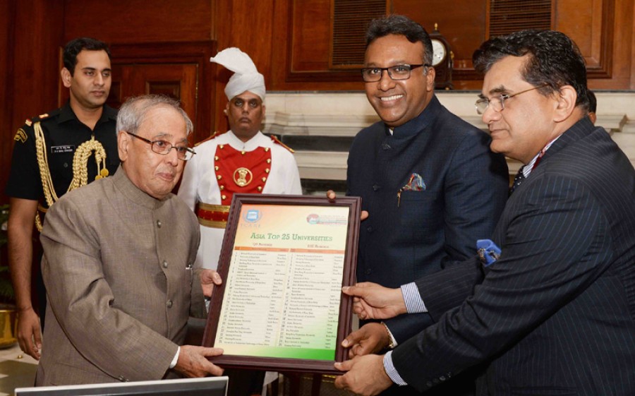 नई दिल्ली। राष्ट्रपति प्रणब मुखर्जी ने राष्ट्रपति भवन में एक समारोह में ओपी जिंदल ग्लोबल यूनिवर्सिटी और इंडियन सेंटर फार अकादमिक रैंकिंग एंड एक्सिलेंस से 'वैश्विक शैक्षिक रैंकिंग में भारतीय विश्वविद्यालयों के स्थान' के बारे एक रिपोर्ट प्राप्त की। रिपोर्ट की कुछ मुख्य विशेषताएं इस प्रकार हैं-भारतीय संस्थानों के कार्यनिष्पादन में क्यूएस यूनिवर्सिटी रैंकिंग एशिया 2016 में 17 देशों से शीर्ष 350 विश्वविद्यालयों की तुलना में अत्यंत शानदार बढ़ोतरी हुई है। भारत के 5 संस्थान शीर्ष 50 संस्थानों में और 9 संस्थान शीर्ष 100 संस्थानों में शामिल किए गए हैं। इस तरह की रैंकिंग के इतिहास में पहली बार भारत के सबसे उत्कृष्ट सभी 10 संस्थानों ने रचनात्मक वृद्धि प्रदर्शित की है। इनमें से 9 संस्थानों का नेतृत्व राष्ट्रपति ने विजिटर के रूप में किया है, जबकि 10वां यानी कलकत्ता विश्वविद्यालय उनका मातृ संस्थान रहा है।