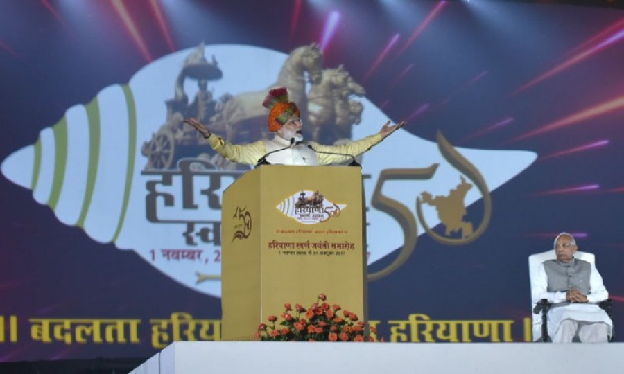 गुरूग्राम (हरियाणा)। प्रधानमंत्री नरेंद्र मोदी हरियाणा राज्य के स्वर्ण जयंती समारोह में बिल्कुल हरियाणवी ही हो गए। उन्होंने गुरूग्राम में हरियाणा और वहां के निवासियों एवं उनके हर क्षेत्र में अनुकरणीय योगदान लिए अपने उद्गारों की झड़ी लगा दी। स्वर्ण जयंती का शुभारंभ करते हुए हरियाणावासियों को शुभकामनाएं देते हुए कहा कि वास्तव में स्वर्ण जयंती का अवसर न किसी दल का है, न किसी सरकार का है, ये अवसर हर एक हरियाणवी का है। इस समारोह में प्रधानमंत्री की मौजूदगी में यह बात हरियाणा के मुख्यमंत्री मनोहर लाल खट्टर ने कही थी। अपने को इससे जोड़ते हुए प्रधानमंत्री ने आगे कहा कि जैसे व्यक्ति के जीवन में भी सालगिरह मनाना, कुछ विशेष अवसरों को मनाना उसे नए संकल्प लेने की प्रेरणा देता है, वैसे ही समाज को और राज्य को इस प्रकार के अवसर कुछ नया करने का संकल्प करने के लिए प्रेरणा देते हैं। प्रधानमंत्री ने कहा कि इस स्वर्णिम जयंती के कालखंड में मैं हरियाणावासियों से प्रार्थना करूंगा कि वे हरियाणा बनाने के लिए जो आंदोलन चलाए गए, विचार प्रस्तुत किए गए, हरियाणवी सोच के साथ कहां से कहां तक पहुंचे, अभी और कितना चलना पड़ेगा, इसके लिए और क्या कर सकते हैं, वे इसका विचारण करें, उनके पास इसका लेखाजोखा होना चाहिए।