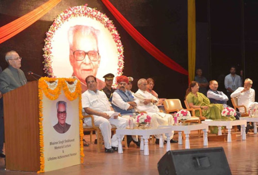 जयपुर। राष्ट्रपति प्रणब मुखर्जी ने जयपुर में 'भारत में संसदीय लोकतंत्र का इतिहास' विषय पर प्रथम भैरों सिंह शेखावत स्मारक व्याख्यान दिया। उन्होंने इस अवसर पर सिक्किम के मुख्यमंत्री पवन कुमार चामलिंग को सार्वजनिक सेवा में प्रथम भैरों सिंह शेखावत लाइफ टाइम अचीवमेंट पुरस्कार से भी सम्मानित किया। राष्ट्रपति प्रणब मुखर्जी ने उपस्थित जनसमूह को संबोधित करते हुए कहा कि वह हमारे पूर्व उपराष्ट्रपति भैरों सिंह शेखावत की याद में गठित प्रथम स्मारक व्याख्यान देने में गर्व का अनुभव कर रहे हैं, जो एक असाधारण राजनेता और आम आदमी से जुड़े नेता थे। राष्ट्रपति ने कहा कि भैरों सिंह शेखावत और मैंने मित्रता का एक लंबा समय साझा किया, दोनों 1970 के दशक में एक साथ राज्यसभा में थे।