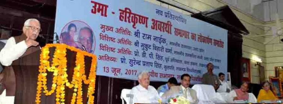 लखनऊ। उत्तर प्रदेश के राज्यपाल और विश्वविद्यालयों के कुलाधिपति राम नाईक ने आज लखनऊ विश्वविद्यालय में विश्वविद्यालय के कुलपति रहे प्रोफेसर हरिकृष्ण अवस्थी के चित्र पर श्रद्धासुमन अर्पित करते हुए उमा-हरिकृष्ण अवस्थी सभागार का उद्घाटन किया। उल्लेखनीय है कि सभागार का नामकरण लखनऊ विश्वविद्यालय के कुलपति रहे प्रोफेसर हरिकृष्ण अवस्थी और उनकी पत्नी उमा अवस्थी के नाम पर किया गया है। राम नाईक ने कहा कि प्रोफेसर हरिकृष्ण अवस्थी ने अपने कार्यकाल में विश्वविद्यालय से कुलपति के तौर पर कोई मानदेय नहीं लिया और उनके परिजनों ने इस सभागार के निर्माण का व्यय भी स्वयं उठाया है, जो अपने आप में एक प्रशंसनीय संदेश है। उन्होंने कहा कि प्रोफेसर हरिकृष्ण अवस्थी के परिजनों की यह कृति वास्तव में सराहनीय है। राज्यपाल ने कहा कि वे लखनऊ विश्वविद्यालय के कई कार्यक्रमों में आ चुके हैं, लेकिन आज के कार्यक्रम की कुछ अलग विशेषता है, जैसे भगवान राम के नाम के पहले सीता का नाम और श्रीकृष्ण के नाम के पहले राधा के नाम का कुछ अलग आनंद है, उसी प्रकार सभागार का नाम उमा-हरिकृष्ण अवस्थी रखा गया है, जो अति उत्तम है।