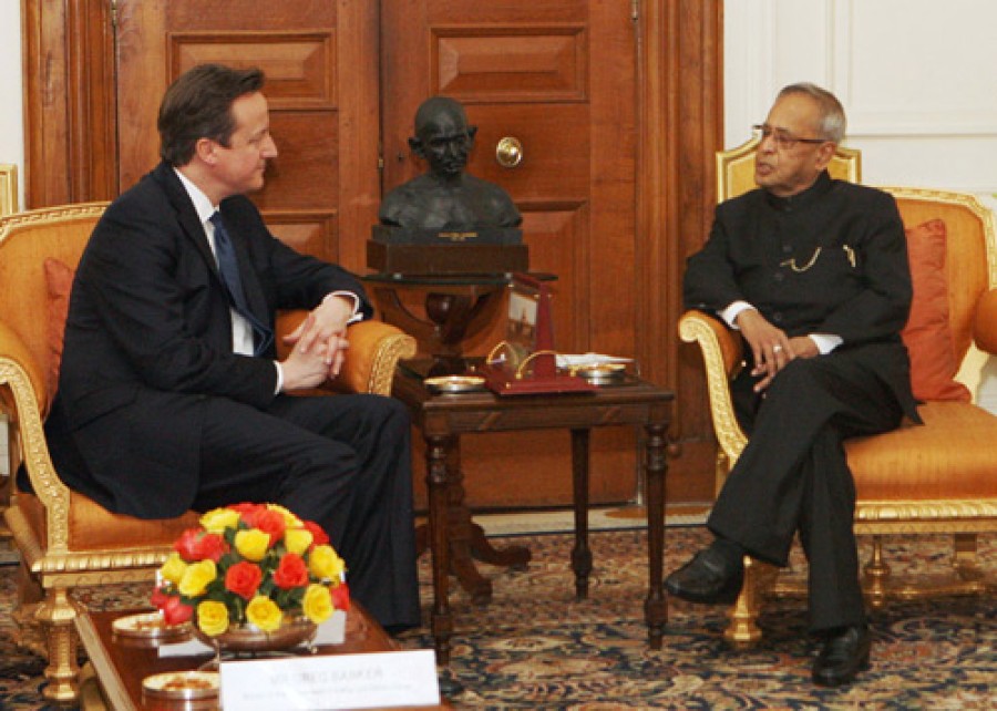 नई दिल्ली। ब्रिटेन के प्रधानमंत्री डेविड कैमरन ने मंगलवार को राष्ट्रपति प्रणव मुखर्जी से राष्ट्रपति भवन में मुलाकात की। डेविड कैमरन का स्वागत करते हुए राष्ट्रपति ने कहा कि उनके दौरे और विस्तृत एजेंडे से ब्रिटेन की भारत के प्रति गहरी प्रतिबद्धता प्रदर्शित होती है। ब्रिटेन की भारत के साथ एक खास नए रिश्ते की आकांक्षा है। दोनों देशों ने अपने बहुआयामी द्विपक्षीय एजेंडे को और समृद्ध बनाया है। राष्ट्रपति ने कहा कि भारत सरकार दोनों देशों के बीच साझेदारी को काफी अहम मानती है और सभी क्षेत्रों खासकर व्यापार और निवेश, रक्षा, शिक्षा, विज्ञान और प्रौद्योगिकी में इसे सुदृढ़ करने की इच्छुक है। दोनों देशों को आतंकवाद को समाप्त करने में सहयोग को अहमियत देनी चाहिए।