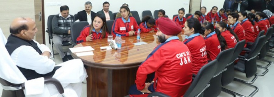 नई दिल्ली। जम्मू-कश्मीर महिला फुटबॉल खिलाड़ियों ने केंद्रीय गृहमंत्री राजनाथ सिंह से नई दिल्ली में मुलाकात की। तीन अधिकारियों सहित 25 खिलाड़ियों की जम्मू-कश्मीर ‘चीफ मिनिस्टर्स XI’ टीम हाल ही में महाराष्ट्र के कोल्हापुर में भारतीय महिला फुटबॉल लीग चैंपियनशिप में शामिल हुई थी। महिला फुटबॉल खिलाड़ियों में 22 लड़कियों में 11 जम्मू-कश्मीर की हैं, जिनमें से 4 जम्मू क्षेत्र और 2 लद्दाख से हैं। गृहमंत्री से बातचीत के दौरान लड़कियों ने कहा कि जम्मू-कश्मीर में भी खेल के बेहतर बुनियादी ढांचे, सुविधाएं तैयार करने और राज्य के युवाओं की आकांक्षाओं को पूरा करने के लिए अधिक अवसर उपलब्ध कराने पर विशेष ध्यान दिया जाना चाहिए। गृहमंत्री राजनाथ सिंह ने भी उन्हें आश्वस्त करते हुए कहा कि हर क्षेत्र के खेल एवं खिलाड़ियों को अवसर और सुविधाएं अवश्य उपलब्ध कराई जाएंगी।