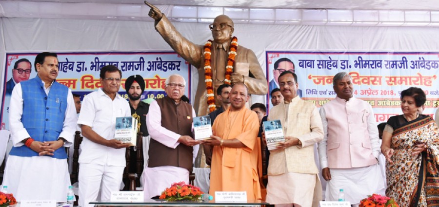 लखनऊ। राज्यपाल राम नाईक और मुख्यमंत्री योगी आदित्यनाथ ने आज बाबासाहेब डॉ भीमराव रामजी आंबेडकर की 127वीं जयंती पर आंबेडकर महासभा लखनऊ के कार्यक्रम में बाबासाहेब के चित्र और प्रतिमा पर पुष्प चढ़ाकर तथा अस्थिकलश के दर्शनकर उन्हें श्रद्धांजलि अर्पित की। कार्यक्रम में उपमुख्यमंत्री डॉ दिनेश शर्मा, ग्राम्य विकास राज्यमंत्री डॉ महेंद्र्र सिंह, अल्पसंख्यक कल्याण राज्यमंत्री बलदेव ओलख, लखनऊ की महापौर संयुक्ता भाटिया, आंबेडकर महासभा के अध्यक्ष डॉ लालजी प्रसाद निर्मल और विशिष्टजनों ने भी बाबासाहेब को श्रद्धासुमन अर्पित किए। कार्यक्रम में आंबेडकर महासभा ने मुख्यमंत्री योगी आदित्यनाथ का सम्मान ‘दलित मित्र’ के रूपमें किया।
