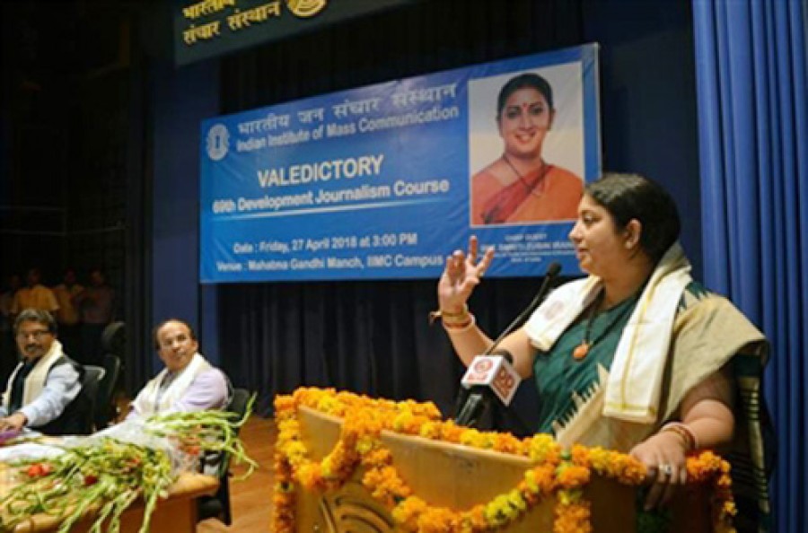 नई दिल्ली। केंद्रीय सूचना एवं प्रसारण मंत्री स्मृति जुबिन इरानी ने नई दिल्ली के आईआईएमसी के नाम से विख्यात भारतीय जन संचार संस्थान के विकास पत्रकारिता पाठ्यक्रम के 69वें समापन सत्र को संबोधित किया और कहा कि भारतीय मूल के जिन लोगों ने विकास पत्रकारिता के लिए अनुकरणीय कार्य किया है, उनको पंडित दीनदयाल उपाध्याय की स्मृति में 25,000 रुपये की एक छात्रवृत्ति दी जाएगी। उन्होंने 16 देशों के विकास पत्रकारिता से जुड़े 25 छात्रों को प्रमाण पत्र भी प्रदान किए। स्मृति जुबिन इरानी ने आईआईएमसी परिसर में राष्ट्रीय मीडिया संकाय विकास केंद्र का उद्घाटन भी किया। उन्होंने ईसीएचओ न्यूजलेटर, समाचार माध्यम एवं कम्यूनिकेटर पत्रिकाएं लांच कीं।