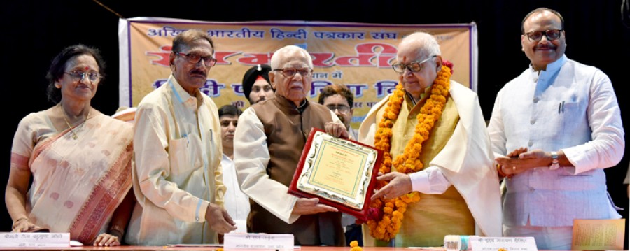 लखनऊ। राज्यपाल राम नाईक ने हिंदी पत्रकारिता दिवस पर उत्तर प्रदेश विधानसभा के अध्यक्ष हृदयनारायण दीक्षित को स्मृति चिन्ह व अंग वस्त्र देकर ‘बाबूराव विष्णु पराड़कर पत्रकारिता शिखर सम्मान’ से सम्मानित किया। हिंदी संस्था रंग भारती और अखिल भारतीय हिंदी पत्रकार संघ ने हिंदी संस्थान के यशपाल सभागार में एक कार्यक्रम का आयोजन किया था, जिसका राज्यपाल राम नाईक ने दीप प्रज्जवलित कर उद्घाटन किया। रंग भारती के अध्यक्ष श्याम कुमार ने इस दौरान राज्यपाल को इलाहाबाद का नाम पूर्व के भांति प्रयागराज करने का एक ज्ञापन भी सौंपा। राज्यपाल राम नाईक ने कार्यक्रम को संबोधित करते हुए कहा कि पत्रकारों का देश के नवनिर्माण में सराहनीय योगदान है।