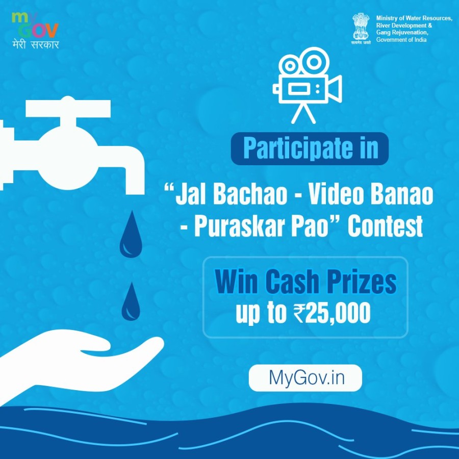 जल संसाधन नदी विकास एवं गंगा संरक्षण मंत्रालय भारत के लोगों से जल संरक्षण, जल उपयोग के सर्वोत्तम उपाय और देश के विभिन्‍न भागों में जल संसाधन, विकास और प्रबंधन से संबंधित क्षेत्रों में हुए प्रयासों, महत्वपूर्ण योगदानों और बेहतर पद्धतियों को दर्शाती हुई वीडियो को अपलोड करने की अपील की है। मंत्रालय ने जल संरक्षण से संबंधित विज्ञापन या कमर्शियल भी आमंत्रित किए हैं। वीडियो की अवधि कम से कम दो मिनट से अधिकतम 10 मिनट तक का होना चाहिए। वीडियो हिंदी, अंग्रेजी या किसी अन्‍य क्षेत्रीय भाषा में भेजी जा सकती है और इन प्रविष्टियों को प्रतियोगिता में शामिल करते समय, इंडियन कॉपीराइट अधिनियम 1957 या किसी तृतीय पक्ष के बौद्धिक संपदा अधिकारों के किसी प्रावधान का हनन नहीं होना चाहिए।