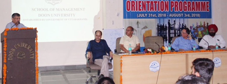 देहरादून। दून विश्वविद्यालय के स्कूल ऑफ मैनेजमेंट के एमबीए, इंटेग्रेटेड एमबीए और बीकॉम ऑनर्स के नवप्रवेशित छात्रों के ओरिएंटेशन कार्यक्रम में पंजाबी यूनिवर्सिटी पटियाला के प्रबंध संकाय विभागाध्यक्ष प्रोफेसर गुरूचरण सिंह ने छात्रों को मैनेजमेंट टर्म पे-ऑफ मैट्रिक्स को टीम में काम करने के मूलमंत्र मैंनेजमेंट गेम्स के जरिए समझाया। उन्होंने संस्थान और प्रबंधक की ग्रोथ हेतु टीम में कार्य करने की स्किल पर जोर दिया। इसी प्रकार बिड़ला ग्रुप के पूर्व महाप्रबंधक एवं आईएसटीडी लखनऊ के अध्यक्ष तथा प्रसिद्ध कारपोरेट ट्रेनर एमएम खान ने लीडरशिप, कॉन्फिक्ट मैनेजमेंट और पर्सनालिटी डेवलेपमेंट पर छात्रों को संबोधित करते हुए जीवन में सफलता के रास्ते बताए।