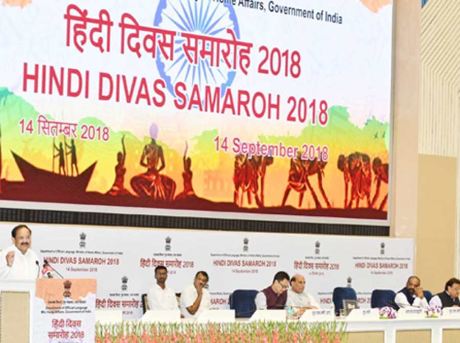 नई दिल्ली। केंद्रीय गृह मंत्रालय के राजभाषा विभाग की ओर से विज्ञान भवन दिल्ली में हिंदी दिवस समारोह का आयोजन किया गया, जिसमें उपराष्ट्रपति वेंकैया नायडु ने विभिन्न मंत्रालयों, विभागों और कार्यालयों के प्रमुखों को राजभाषा कार्यांवयन में उत्कृष्टकार्य हेतु पुरस्कृत भी किया। उपराष्ट्रपति वेंकैया नायडु ने इस अवसर पर कहा कि मातृभाषा आंख होती है, जबकि पराई भाषा चश्मा, यदि आंख ही नहीं होगी तो चश्मे का क्या महत्व रह जाता है। वेंकैया नायडु ने जीवन में पांच चीजों की महत्ता बताते हुए कहा कि हमें मां, जन्मभूमि, मातृभाषा, मातृदेश और गुरू का हमेशा ध्यान रखना चाहिए एवं आवश्यकता पड़ने पर इन पांचों की सेवा के लिए तत्पर होना चाहिए। उपराष्ट्रपति ने कहा कि मातृभाषा में प्राथमिक शिक्षा अनिवार्य होनी चाहिए, ताकि उच्चशिक्षा अपनी भाषा में मिलने में आसानी हो सके। उनका कहना था कि हिंदी के बिना हिंदुस्तान में आगे बढ़ना संभव नहीं है, लेकिन हिंदी ज्ञान परस्पर सहभागिता से संभव किया जाना चाहिए।