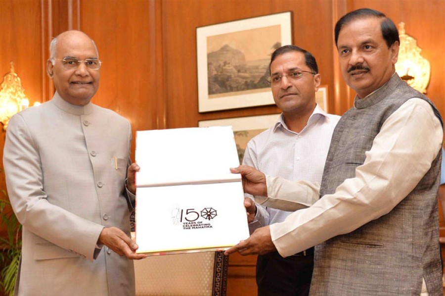 नई दिल्ली। राष्ट्रपति रामनाथ कोविंद ने राष्ट्रपिता महात्मा गांधी की 150वीं जयंती पर स्मरणोत्सव के लिए 'लोगो' और वेबपोर्टल लांच किया। राष्ट्रपति भवन में यह लोगो संस्कृति राज्यमंत्री डॉ महेश शर्मा और संस्कृति सचिव अरुण गोयल की मौजूदगी में जारी किया गया। वेबपोर्टल का लिंक http://gandhi.gov.in है। यह लोगो आम नागरिकों से मंगाया गया है। इसकी ब्रांडिंग रेलगाड़ियों, मेट्रो रेल, एयर इंडिया के विमानों, राज्य रोडवेज की बसों, सरकारी वेबसाइटों, ई-मेल, कैलेंडर एवं डायरी जैसी सरकारी स्टेशनरी, सरकारी विज्ञापनों एवं प्रचार सामग्रियों, डिजिटल सिग्नेचर इत्यादि के जरिए होगी।
