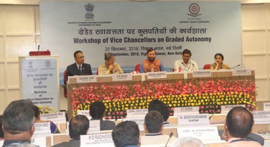 मानव संसाधन विकास मंत्रालय के उच्चतर शिक्षा के सचिव आर सुब्रमण्यम ने गुणवत्तापूर्ण शिक्षा को बढ़ावा देने में विश्वविद्यालयों को सक्षम बनाने में महत्वपूर्ण जानकारियां उपलब्ध कराईं। बनारस हिंदू विश्वविद्यालय, गुरूनानक देव विश्वविद्यालय, अलागप्पा विश्वविद्यालय, बिट्स पिलानी, सिम्बॉयोसिस इंटरनेशनल, रसायन प्रौद्योगिकी संस्थान एवं ओपी जिंदल ग्लोबल विश्वविद्यालय के कुलपतियों ने ग्रेडेड स्वायत्तता के उद्देश्यों को अर्जित करने के लिए प्रस्तुतियां दीं।मानव संसाधन विकास मंत्रालय एवं विश्वविद्यालय अनुदान आयोग ने लगभग 63 विश्वविद्यालयों के कुलपतियों को, जिन्हें ग्रेडेड स्वायत्तता पर यूजीसी विनियमनों के तहत श्रेणी I एवं श्रेणी II में वर्गीकृत किया गया है, उनको एक मंच उपलब्ध कराने के विचार से संयुक्त रूपसे कार्यशाला का आयोजन किया था।