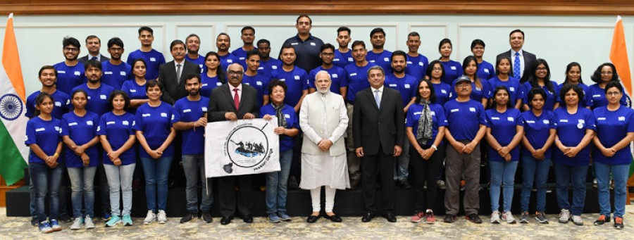 नई दिल्ली। गंगा नदी की साफ-सफाई को लेकर जागरुकता फैलाने के लिए मिशन गंगे अभियान पर निकले 40 सदस्यीय दल ने आज नई दिल्ली में प्रधानमंत्री नरेंद्र मोदी से भेंट की। दुनिया की सबसे ऊंची पर्वत चोटी माउंट एवरेस्ट को फतह करने वाली पहली भारतीय महिला बछेंद्री पाल के नेतृत्व वाले इस अभियान दल में माउंट एवरेस्ट पर सफल चढ़ाई करने वाले 8 पर्वतारोही भी शामिल हैं। प्रधानमंत्री नरेंद्र मोदी ने अभियान दल के सदस्यों से बातचीत में उनके द्वारा की जा रही पहल की सराहना की और गंगा नदी की सफाई के महत्व को रेखांकित किया।