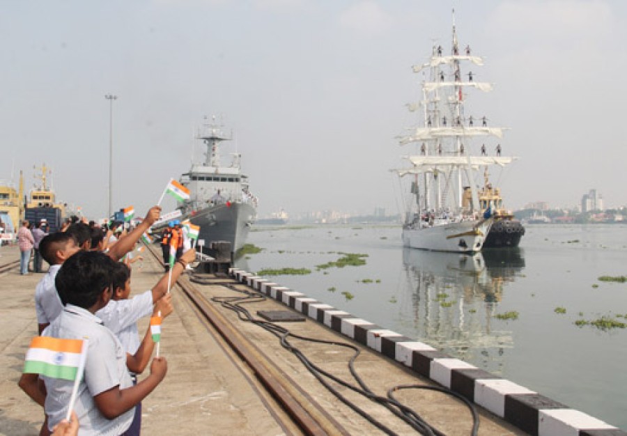 कोच्चि में नौसेना बेस पर तरंगिनी जहाज की भव्य अगवानी