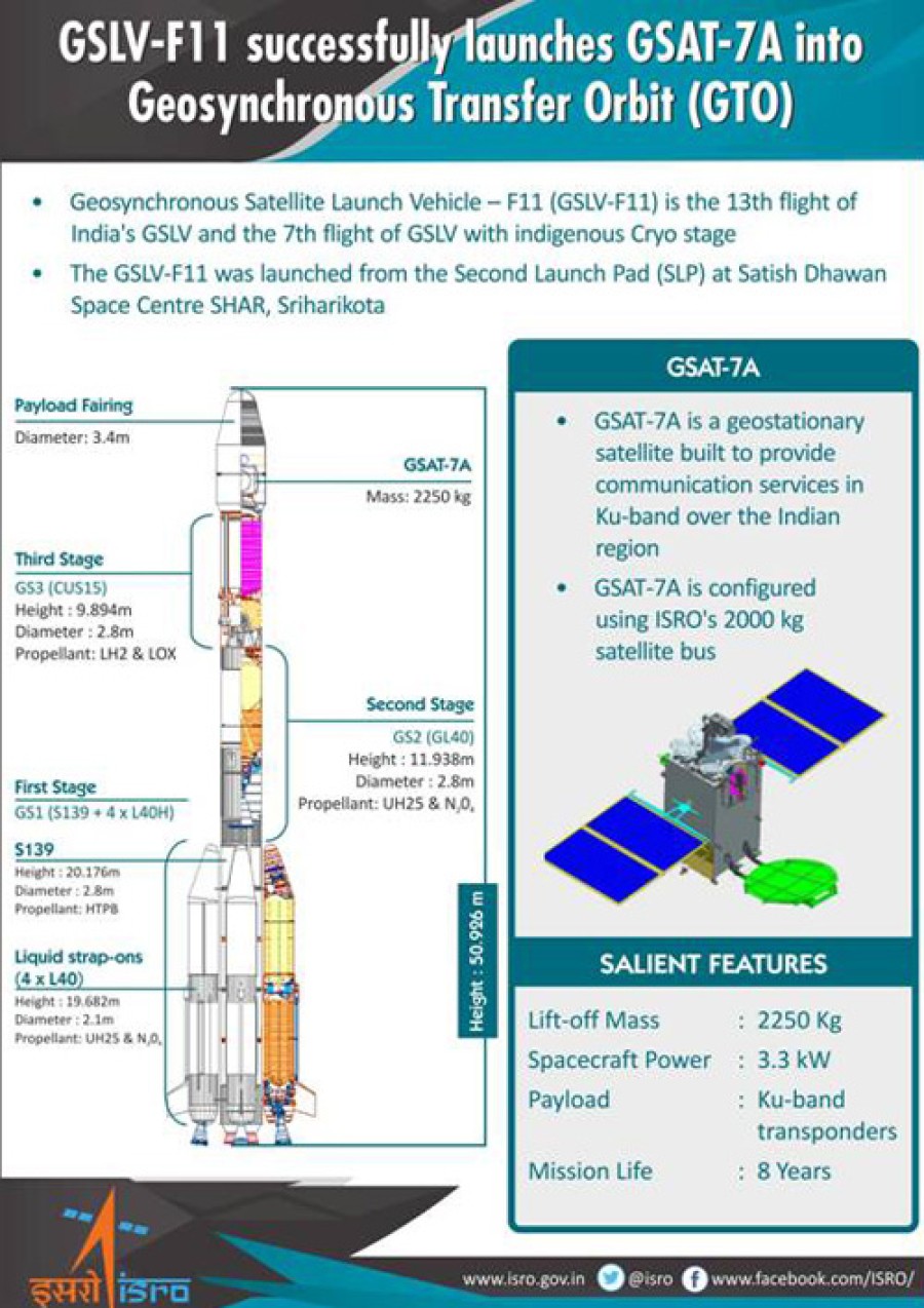 श्रीहरिकोटा। आंध्र प्रदेश में सतीश धवन अंतरिक्ष केंद्र श्रीहरिकोटा से भारतीय अंतरिक्ष अनुसंधान संगठन यानी इसरो के जियोसिनक्रोनस सेटेलाइट लांच व्हेकिल ने सफलतापूर्वक जीसैट-7ए को लांच किया। लांच के समय इसरो के अध्यक्ष डॉ के सिवान के नेतृत्व में विक्रम साराभाई अंतरिक्ष केंद्र के निदेशक एस सोमनाथ, यूआर राव उपग्रह केंद्र के निदेशक पी कुन्हीकृष्णन, अंतरिक्ष उपयोग केंद्र के निदेशक डीके दास, सतीश धवन अंतरिक्ष केंद्र के निदेशक एस पांडियन, द्रव नोदन प्रणाली केंद्र के डॉ वी नारायणन और इसरो नोदन परिसर के निदेशक टी मूकियाह भी उपस्थित थे। ये सभी इसरो की टीम में शामिल थे। उनके साथ मिशन निदेशक मोहन एम और उपग्रह निदेशक किलेदार पंकज दामोदर ने भी लांच गतिविधियों को देखा।