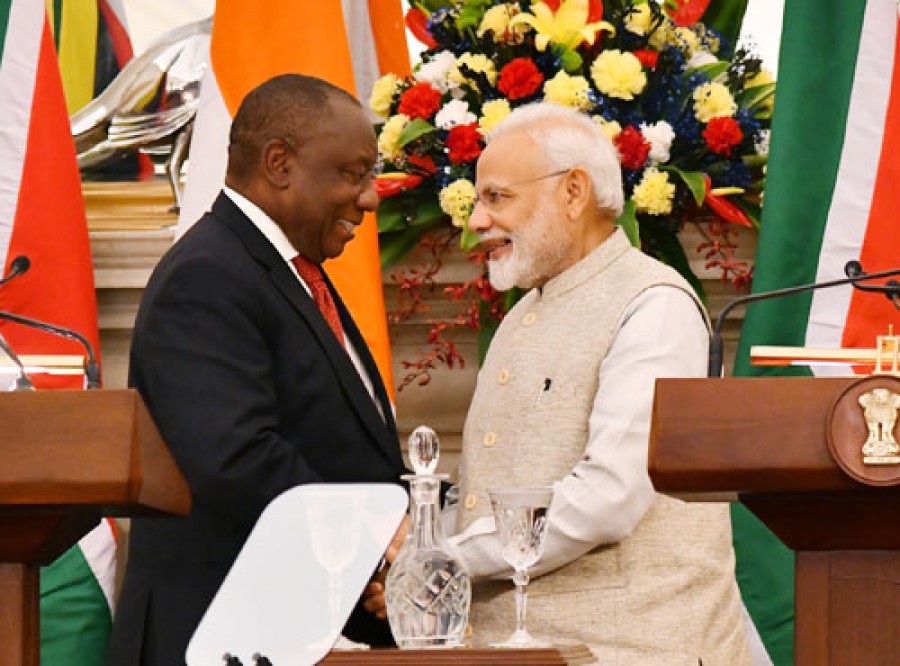 प्रधानमंत्री नरेंद्र मोदी ने दक्षिण अफ्रीकी राष्ट्रपति मटामेला सिरिल रामफौसा की भारत यात्रा पर एक प्रेस वक्तव्य में कहा है कि हमारे लिए बहुत हर्ष का विषय है कि भारत के अभिन्न मित्र दक्षिण अफ्रीका के राष्ट्रपति मटामेला सिरिल रामफौसा आज हमारे बीच मौजूद हैं, उनके लिए भारत नया नहीं है, लेकिन राष्ट्रपति के रूपमें यह उनकी पहली भारत यात्रा है और उनकी यह भारत यात्रा हमारे संबंधों के एक विशेष मुकाम पर हो रही है। उन्होंने कहा कि इस वर्ष महात्मा गांधी की 150वीं वर्षगांठ है, पिछला वर्ष नेल्सन मंडेला की जन्मशताब्दी का वर्ष था और पिछले साल हमारे राजनयिक संबंधों की रजत जयंती भी थी।
