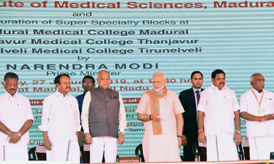प्रधानमंत्री नरेंद्र मोदी ने कहा कि प्रधानमंत्री स्वास्थ्य सुरक्षा योजना का लक्ष्य देशभर में 73 चिकित्सा महाविद्यालयों का उन्नयन करना है और इसके एक हिस्से के रूपमें उन्होंने मदुरै के राजाजी चिकित्सा महाविद्यालय के सुपर स्पेशिएलिटी ब्लॉक्स, तंजावुर चिकित्सा महाविद्यालय एवं तिरुनेलवेल्ली चिकित्सा महाविद्यालय का भी उद्घाटन किया। प्रधानमंत्री ने तीन सरकारी चिकित्सा महाविद्यालयों में सुपर स्पेशिएलिटी ब्लॉक्स का उद्घाटन करने पर प्रसन्नता जताई। एनडीए सरकार की स्वास्थ्य क्षेत्र पर प्राथमिकता को दोहराते हुए प्रधानमंत्री ने कहा कि हमें यह सुनिश्चित करना है कि सभी स्वस्थ हों और स्वास्थ्य देखभाल किफायती हो। उन्होंने कहा कि जिस गति एवं परिमाण से मिशन इंद्रधनुष कार्य कर रहा है, वह बचाव संबंधी स्वास्थ्य देखभाल में एक नया उदाहरण प्रस्तुत कर रहा है। उन्होंने कहा कि प्रधानमंत्री मातृत्व वंदना योजना और प्रधानमंत्री सुरक्षित मातृत्व अभियान सुरक्षित गर्भावस्था को एक जनांदोलन बना रहे हैं। उन्होंने कहा कि इन साढ़े चार वर्ष में पूर्व स्नातक मेडिकल सीटों की संख्या में लगभग 30 प्रतिशत की वृद्धि हुई है।