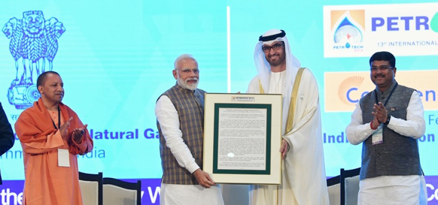 ग्रेटर नोएडा। प्रधानमंत्री नरेंद्र मोदी ने आज ग्रेटर नोएडा में इंडिया एक्सपो मार्ट में भारत के प्रमुख हाइड्रोकार्बन सम्मेलन और प्रदर्शनी पेट्रोटेक-2019 का उद्घाटन किया। इस अवसर पर प्रधानमंत्री ने संयुक्त अरब अमीरात के विदेश मंत्री और सीईओ एडीएनओसी डॉ सुल्तान अल अहमद जाबेर को लाइफटाइम अचीवमेंट इंटरनेशनल अवार्ड प्रदान किया। सम्मेलन में उत्तर प्रदेश के मुख्यमंत्री योगी आदित्यनाथ, केंद्रीय पेट्रोलियम एवं प्राकृतिक गैस तथा कौशल विकास एवं उद्यमिता मंत्री धर्मेंद्र प्रधान, संस्कृति राज्यमंत्री महेश शर्मा, विदेश से पधारे मंत्री और प्रतिष्ठित प्रतिनिधि भी उपस्थित थे। धर्मेंद्र प्रधान ने सम्मेलन को संबोधित करते हुए कहा कि प्रधानमंत्री नरेंद्र मोदी के विज़न में भारत के लिए ऊर्जा का बहुत महत्वपूर्ण स्थान है और इन वर्षों में देश में ऊर्जा क्षेत्र में अभूतपूर्व सुधार हुए हैं।
