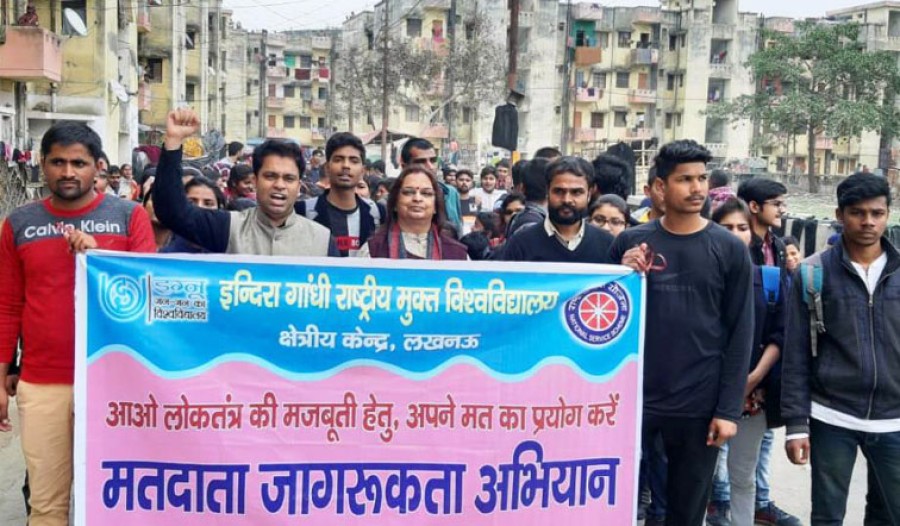 लखनऊ। इंदिरा गांधी राष्ट्रीय मुक्त विश्वविद्यालय क्षेत्रीय केंद्र लखनऊ की राष्ट्रीय सेवा योजना इकाई ने सात दिवसीय एनएसएस और कौशल संवर्धन के विशेष शिविर के दौरान मतदाता जागरुकता कार्यक्रम का आयोजन आज इग्नू क्षेत्रीय केंद्र एवं अंगीकृत मलिन बस्ती में किया। मतदाता जागरुकता कार्यक्रम में जनजाति एवं लोककला सस्कृति संस्थान उत्तर प्रदेश लखनऊ के अध्यक्ष चंद्रराम चौधरी मुख्य अतिथि के रूपमें शामिल हुए। कार्यक्रम में लगभग 200 विद्यार्थियों ने भाग भी लिया, जिन्होंने मलिन बस्ती में नुक्कड़ नाटक एवं रैली के माध्यम से लोगों को मतदान के लिए प्रेरित किया। चंद्रराम चौधरी ने इस अवसर पर विद्यार्थियों से अपने अनुभव साझा करते हुए उनसे संवाद किया और जीवन में लक्ष्य निर्धारण कर समयबद्ध तरीके से उपलब्ध संसाधनों के माध्यम से पूर्ण करने की बात कही। चंद्रराम चौधरी ने मतदान के महत्व के बारे में बताते हुआ सभी नागरिकों का आह्वान किया वे आगामी लोकसभा चुनाव में मतदान देकर अपनी भागीदारी जरूर सुनिश्चित करें और देश सेवा के लिए आगे आएं।