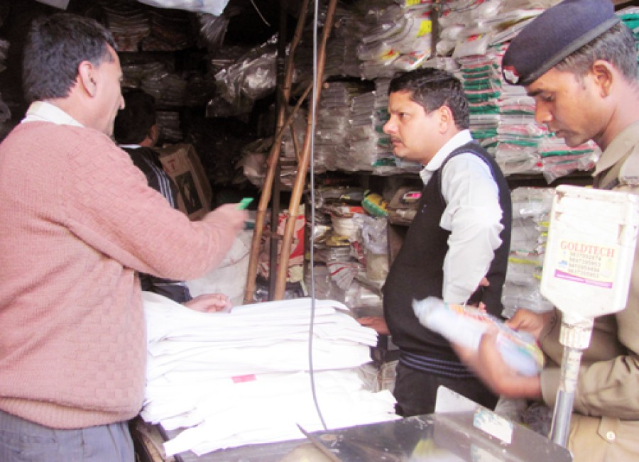 देहरादून। स्वच्छ दून एवं स्वच्छ कैंपस के तहत देहरादून शहर को पालिथीन से मुक्त करने के उद्देश्य से जिलाधिकारी देहरादून बीवीआरसी पुरूषोत्तम ने व्यापारियों को दी गई 15 मार्च 2013 की डेट लाईन समाप्त होने के उपरांत नगर मजिस्ट्रेट हरक सिंह रावत, उप जिलाधिकारी सदर गिरीश गुणवंत एवं नगर निगम तथा पुलिस प्रशासन के संयुक्त तत्वावधान में दर्शनीगेट, हनुमान चौक में थोक विक्रेताओं की दुकानों से आकस्मिक निरीक्षण में लगभग 5 कुंतल प्लास्टिक के गिलास एवं पालिथिन जब्त की गई तथा 14 दुकानदारों से 11500 रूपए चालान के रूप में वसूले गए, जिसमें एक हजार एवं 500 रूपए के चालान भी काटे गए।