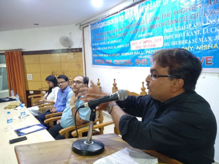 दिलीप सी मंडल ने कहा कि न्यायपालिका में आरक्षण की मांग लम्बे वक़्त से उठती रही है, बिहार में एक दौर ऐसा था, जब जातीय हिंसा ने ज़ोर पकड़ा, उसके बाद सजा देने के मामले में कोर्ट के रवैये को लेकर कई सवाल खड़े हुए, दो दशक के लम्बे संघर्ष के बाद वहां न्यायपालिका में आरक्षण लागू हुआ, आज फिर से एक बार कुछ एकतरफा फैसलों ने इस ओर इशारा किया है, सवाल यही है कि बगैर पक्षपातपूर्ण रवैये से निजात पाना क्या संभव है? प्रोफेसर खालिद अनीस अंसारी ने कहा कि नव-उदारवादी नीति और न्यायालय के सामाजिक न्याय से संबंधित कुछ फैसलों के कारण जन हस्तक्षेप ज़रूरी हो गया है। उन्होंने कहा कि उच्च न्यायालय में विविधता के सिद्धांत को स्थापित करने कि ज़रूरत है, जिससे कि संविधान के आर्टिकल 16 (4) को पूर्ण रूपसे लागू किया जा सके और इसे निजी क्षेत्र में भी प्रतिनिधित्व कोटा के माध्यम से लागू किया जाना चाहिए, इस संदर्भ में कास्ट सेंसस बहुत ज़रूरी हो जाता है, यहां ये ज़रूरी है कि राजनीतिक इच्छाशक्ति निर्णायक होगी।