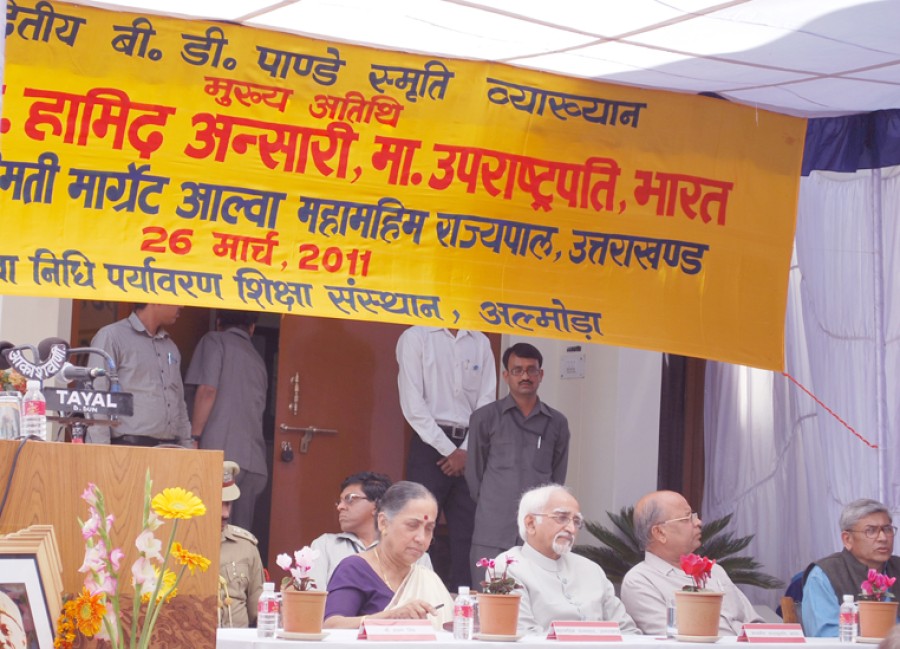 अल्मोड़ा। उपराष्ट्रपति मोहम्मद हामिद अंसारी ने उत्तराखंड सेवा निधि पर्यावरण शिक्षा संस्थान अल्मोड़ा की द्वितीय बीडी पांडे स्मृति व्याख्यान माला में कहा है कि सेवा, शिक्षा और पर्यावरण ये तीनों ही किसी राज्य को प्रगति के पथ पर निरंतर अग्रसर करते हुए उसे नई ऊंचाईयों तक पहुंचाएंगे इस प्रकार नवोदित राज्य उत्तराखंड सतत विकास करते हुए देश के विकसित राज्यों की श्रेणी में आगे बढ़ रहा है। उन्होंने यह भी कहा कि वास्तविक विकास तभी होगा जब सामाजिक, राजनैतिक और आर्थिक गतिविधियों में महिलाओं की अधिकाधिक भागीदारी सुनिश्चित होगी। उन्होंने प्राइमरी स्तर की शिक्षा की सुदृढ़ता पर बल देते हुए कहा कि शिक्षा में गुणात्मक सुधार के लिए 'सर्व शिक्षा अभियान' और उसकी सहयोगी सभी योजनाओं का सही क्रियान्वयन और अपेक्षित लाभ भी तभी मिलेगा जब अभिभावक इनके प्रति जागरूक और सक्रिय होंगे। उपराष्ट्रपति ने संस्थान की गतिविधियों की सराहना और बीडी पांडे को एक कुशल प्रशासक और समर्पित समाज-सेवी बताया जिन्होंने ग्रामीण उत्थान की परिकल्पना को साकार करने के लिए पूर्ण निष्ठा और समर्पण भाव से कार्य किया।