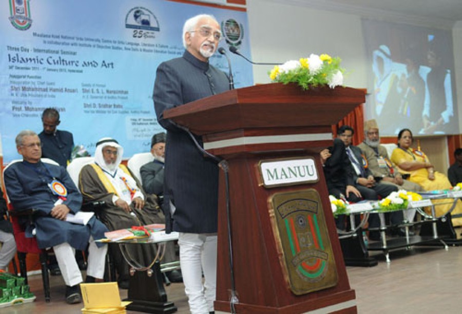 हैदराबाद। उपराष्ट्रपति मोहम्मद हामिद अंसारी ने हैदराबाद के गाछीबावली स्थित मौलाना आजाद राष्ट्रीय उर्दू विश्वविद्यायल में ‘इस्लामिक कला एवं संस्कृति’ विषय पर आयोजित अंतर्राष्ट्रीय संगोष्ठी को संबोधित किया। इस अवसर पर उपराष्ट्रपति ने कहा कि मैं यहां मिश्रित भावों के साथ आया हूं, मैं ऐसे महत्वपूर्ण विश्व पर बोलने के लिए आमंत्रण पाकर गौरवान्वित हूं, विषय की गूढ़ता से डरा भी हूं और अपनी अल्पज्ञता के प्रति गंभीर भी हूं, इसलिए मैं दो दोहों का सहारा लेना चाहूंगा जो सदियों से गंभीर आधार रखते रहे हैं-