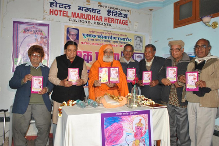 बीकानेर। हास्य व्यंग्य रचनाकार एवं चित्रकार मनोहरलाल हर्ष कवि हृदय की पुस्तक मूषक पुराण का विमोचन रविवार को मरूधर हैरिटेज होटल में हुआ। विमोचन की कार्यक्रम की अध्यक्षता करते हुए लालेश्वर महादेव मंदिर शिवबाड़ी के अधिष्ठाता संवित सोमगिरी जी महाराज ने कहा कि पुराणों में हमारा धर्म और संस्कृति समाहित है, कृति मूषक पुराण में हर्ष ने पुराण शब्द और पुराणों के प्रति श्रद्धाभाव का प्रदर्शन करते हुए पौराणिक प्रसंगों का बारीकी से चित्रण किया है, जो एक बेजोड़ मिसाल है। उन्होंने कहा कि मनोहरलाल हर्ष की कविताओं में गहराई और सौम्यता है, इनके माध्यम से उनके चित्त को टटोलें तो ऐसा लगता है कि मानो वे सागर में कुछ ढूंढ रहे हैं, कविताएं मोती के समान पिरोई हुई लगती हैं। महाराज ने कहा कि कवि ने पौराणिक और समसामयिक घटनाओं को मूषक पुराण में वर्णित करते हुए समाज का ध्यान आकर्षित किया है।