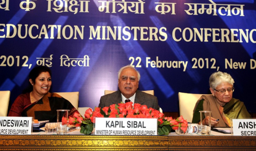 नई दिल्ली। बुधवार को राज्यों और केंद्र शासित प्रदेशों के शिक्षा मंत्रियों का दिल्ली में सम्मेलन हुआ, जिसकी अध्यक्षता मानव संसाधन विकास, सूचना और प्रौद्योगिकी मंत्री कपिल सिब्बल ने की। सम्मेलन में मानव संसाधन विकास राज्यमंत्री डॉ डी पुरनदेश्वरी, राज्य सरकारों एवं केंद्र शासित प्रदेशों के 23 शिक्षा मंत्री, स्कूली शिक्षा एवं साक्षारता विभाग की सचिव अंशु वैश, उच्च शिक्षा की सचिव विभा पुरीदास, विज्ञान एवं प्रौद्योगिकी विभाग के सचिव डॉ टी रामासामी, आईआईटी कानपुर के निदेशक प्रोफेसर संजय जी ढांडे सहित राज्य और केंद्र सरकारों के कई वरिष्ठ अधिकारियों ने भाग लिया।