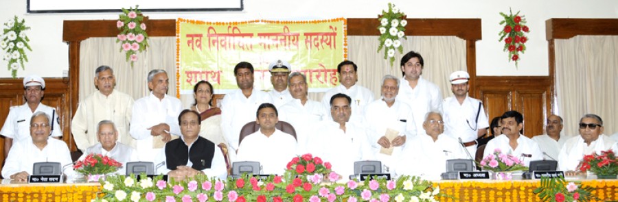 लखनऊ। उत्तर प्रदेश विधान परिषद के सभापति गणेश शंकर पांडेय ने विधान परिषद के द्वि-वार्षिक चुनाव 2012 में नव निर्वाचित विधान परिषद के सदस्य और मुख्यमंत्री अखिलेश यादव सहित 10 सदस्यों को तिलक हॉल में सोमवार को शपथ दिलाई। विधान परिषद के नव निर्वाचित सदस्यों में राजस्व मंत्री अंबिका चौधरी, समाजवादी पार्टी के प्रवक्ता राजेंद्र चौधरी और समाजवादी पार्टी के ही उमर अली खान, नरेश चंद्र उत्तम, मधु गुप्ता, राम सकल गुर्जर एवं विजय यादव के अलावा भारतीय जनता पार्टी के डॉ महेंद्र कुमार सिंह तथा राष्ट्रीय लोक दल के चौधरी मुश्ताक ने शपथ ग्रहण की।