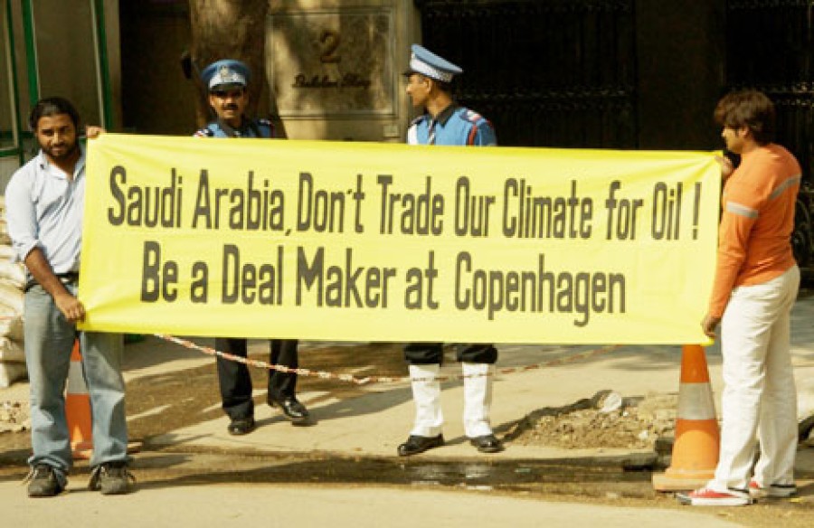 नई दिल्ली। तीन जलवायु संरक्षण कार्यकर्ताओं ने नई दिल्ली में पश्चिम मार्ग पर सऊदी अरब के दूतावास पर एक बैनर फहराया जिसमें लिखा था,'सऊदी अरब तेल व्यापार के लिए कोपेनहेगन में हमारी जलवायु का सौदागर मत बनें!' नई दिल्ली में हुआ यह शांतिपूर्ण विरोध प्रदर्शन दुनिया के 15 विकासशील देशों में एक समय में हो रहे विरोध प्रदर्शन में से एक था। इस मौके पर दुनिया भर के देश बार्सिलोना में एक नए वैश्विक जलवायु समझौते पर बातचीत शुरु कर रहे हैं।