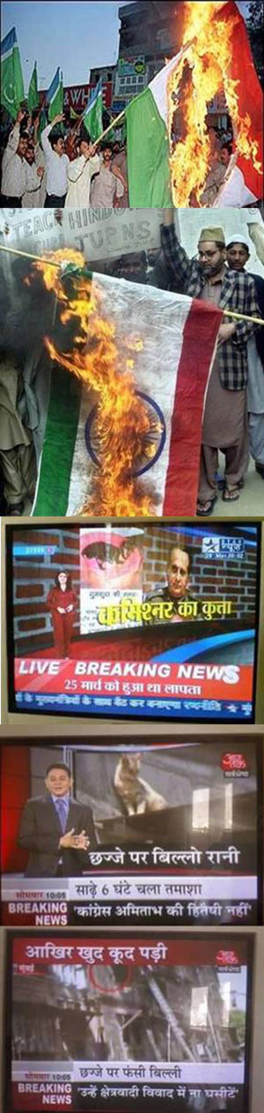 किसीछज्जे पर फंसी बिल्ली और किसी कमिश्नर का कुत्ता चैनल वालों के लिए ब्रेकिंग ख़बर हो सकती है लेकिन कश्मीर में इस तरह से जलाए जा रहे भारतीय ध्वज पर उनकी नज़र नहीं जाती है। कम से कम बाकी भारतीयों और विश्व समुदाय को यह तो पता लगना चाहिए कि कश्मीर में विघटनकारी और आतंकवादी मिलकर किस तरह का खेल खेल रहे हैं। (स्वतंत्र आवाज़ डॉट कॉम को ये तस्वीरें एक दर्शक और पाठक ने ई-मेल की हैं। तस्वीरें और प्रतिक्रियाएं कुछ ऐसी ही हैं जिन्हें आप भी जरूर देखना चाहेंगे)