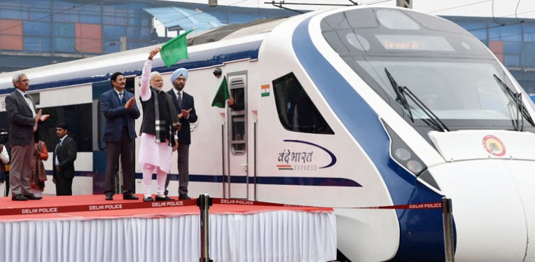 नई दिल्ली। प्रधानमंत्री नरेंद्र मोदी ने 15 फरवरी 2019 को नई दिल्ली रेलवे स्टेशन पर पहली सेमी हाईस्पीड ट्रेन वंदे भारत एक्सप्रेस को हरी झंडी दिखाई।