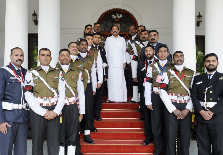 नई दिल्ली। भारतीय गणतंत्र दिवस समारोह के दौरान काफिले में शामिल होने वाले त्रि-सेवाओं के जवानों के साथ नई दिल्ली में एक कार्यक्रम में समूह तस्वीर में उपराष्ट्रपति एम वेंकैया नायडू।