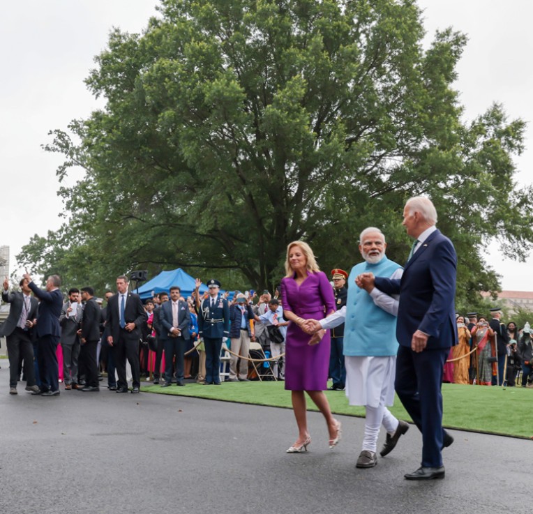 वाशिंगटन डीसी। अमेरिका के राष्ट्रपति जोसेफ बाइडेन और प्रथम महिला डॉ जिल बाइडेन ने प्रधानमंत्री नरेंद्र मोदी का व्हाइट हाउस वाशिंगटन डीसी में आगमन पर जोरदार स्वागत किया। इस अवसर पर नरेंद्र मोदी के स्वागत केलिए हजारों भारतीय-अमेरिकी भी मौजूद थे।